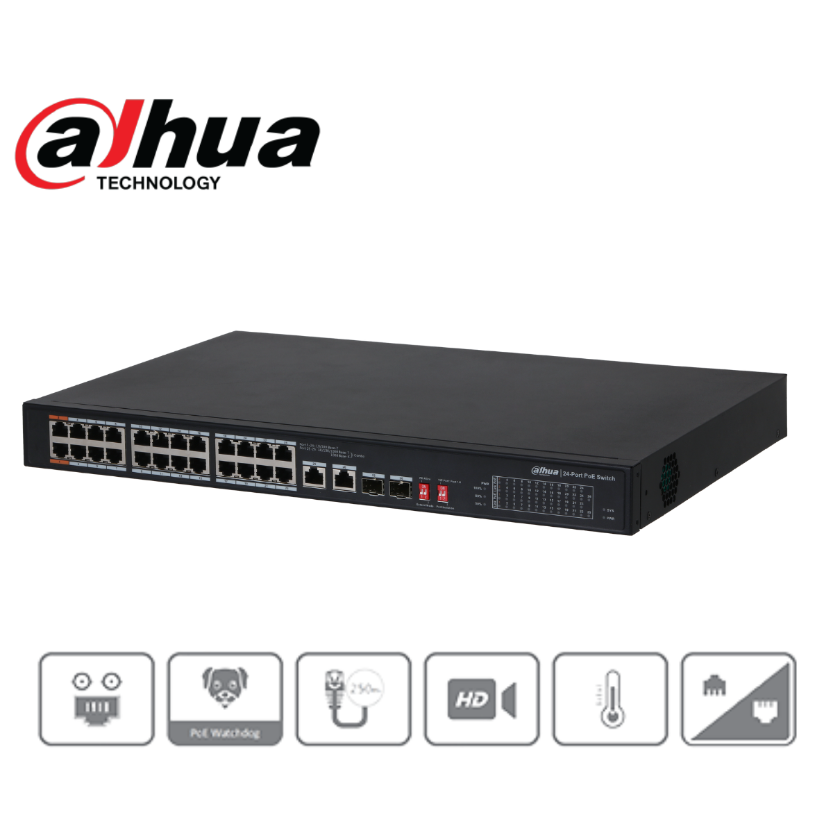 Switch PoE Dahua 24 puertos Watchdog SFPx2 100 Mbps